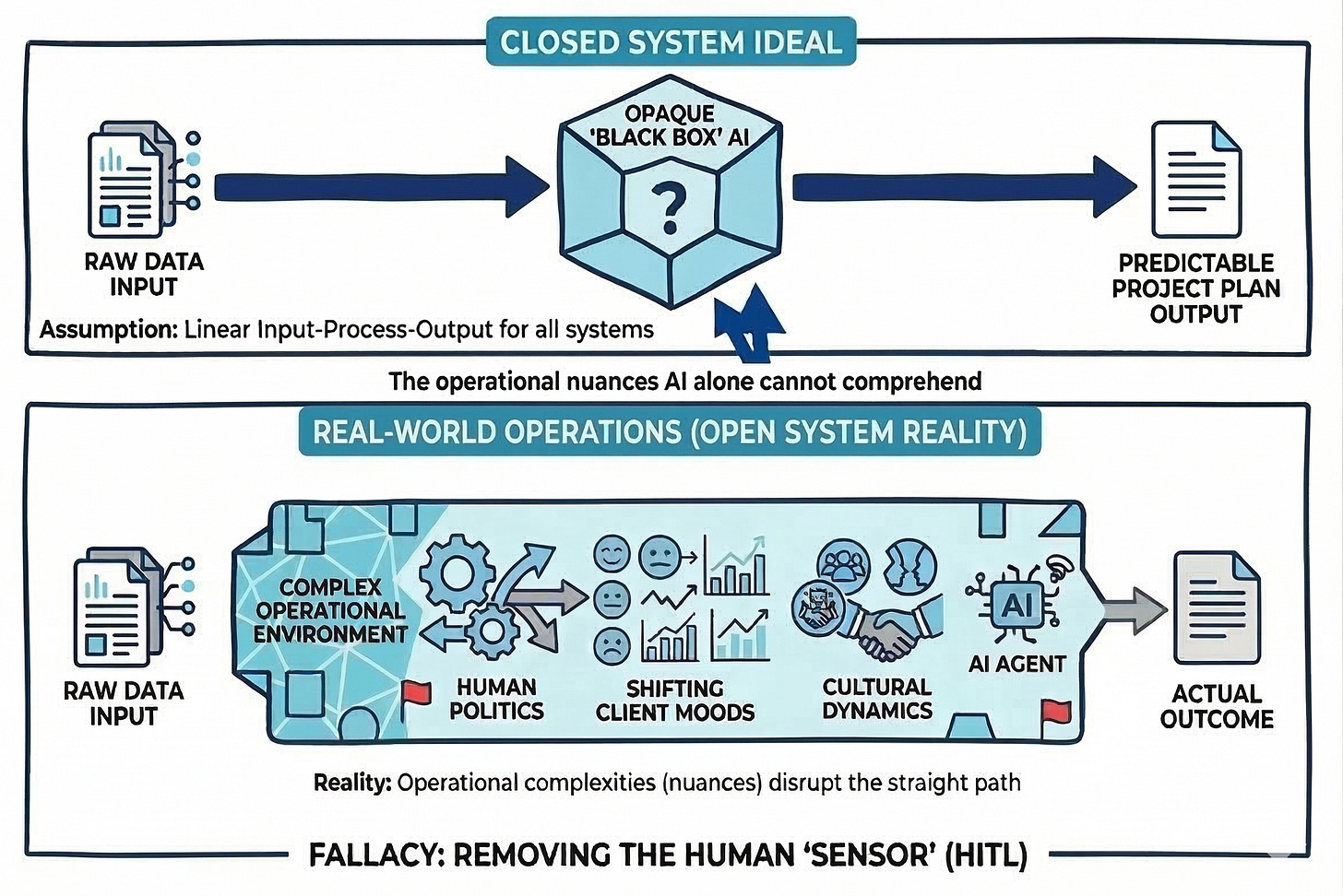 In software engineering, a “Black Box” is a system where you can see the inputs and outputs, but the logic in between is opaque. Many leaders pushing AI initiatives are building black box operations. Feeding raw data into an AI agent and waiting for a project plan to spit out the other side.