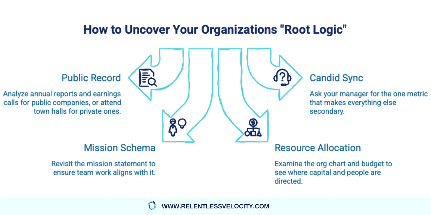 For public companies, annual reports and quarterly earnings calls should serve as your blueprint in uncovering the root logic of your company. For private ones that don’t have this luxury, town halls and all hands meetings are the signal. When attending these sessions, be sure to read between the lines. What is leadership prioritizing? What are they ignoring? If the CEO spends twenty minutes talking about “Efficiency” and zero minutes on “New Markets,” your goals better be focused on optimization, not expansion.